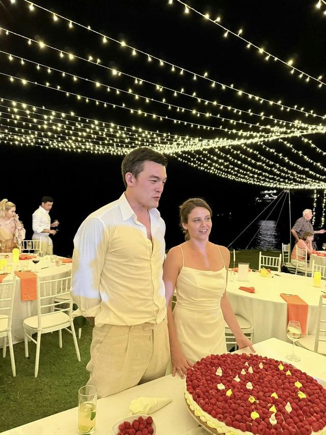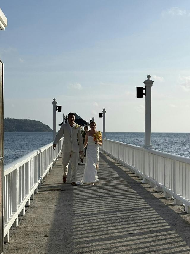 Roger的婚礼是在海边举办的,婚礼仪式的地点在海中,需要通过一条白色的桥才能抵达,而桥的两边是蔚蓝的大海,相当浪漫。Roger穿上了白色的休闲西装,搭配了白色衬衣,没有打领带,而其妻子穿的是白色的吊带婚纱,捧着黄色的花球,总之夫妻俩的打扮都比较简约,主打休闲、优雅。Roger牵着妻子的手走过白色长桥抵达仪式现场,接受祝福,完成宣誓。仪式结束之后,众人在沙滩举办黄昏酒会——这大概也是他们会选择在泰国海岛举办婚礼的原因,走的就是休闲婚礼的路线,有落日晚霞,有海风沙滩,大家手持香槟,享受美食,自由自在。